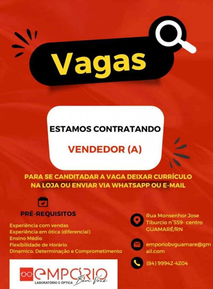 Oportunidade de Emprego: Ótica Empório está precisando de vendedores em Guamaré