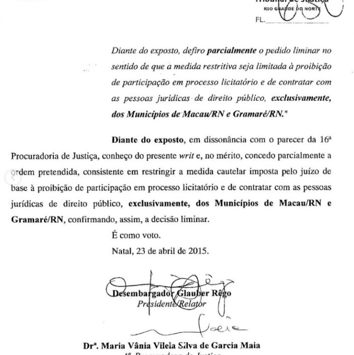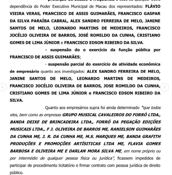 A representante do Ministério Público inclusive disponibilizou a decisão judicial de 2015 onde o Tribunal de Justiça através do Desembargador Glauber Rêgo determina que a Banda Grafith está proibida de participar de processo licitatório e de contratar com as prefeituras de Macau e Guamaré/RN.